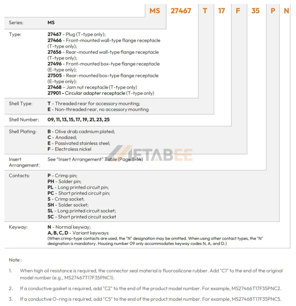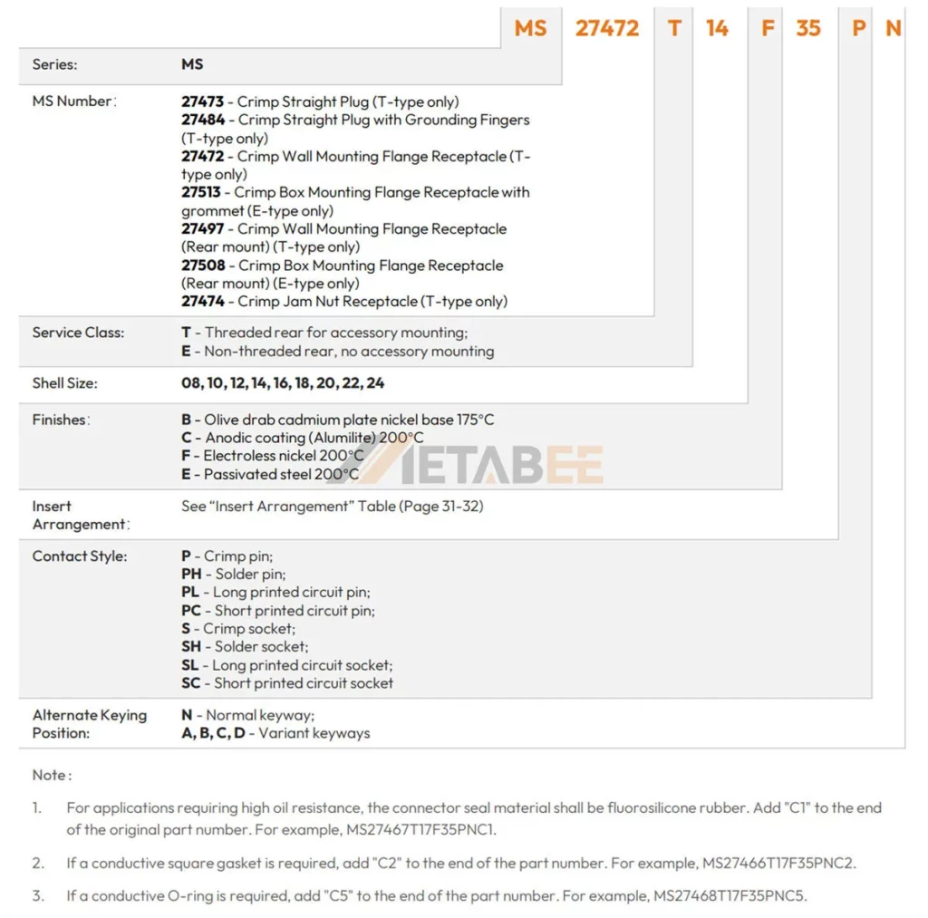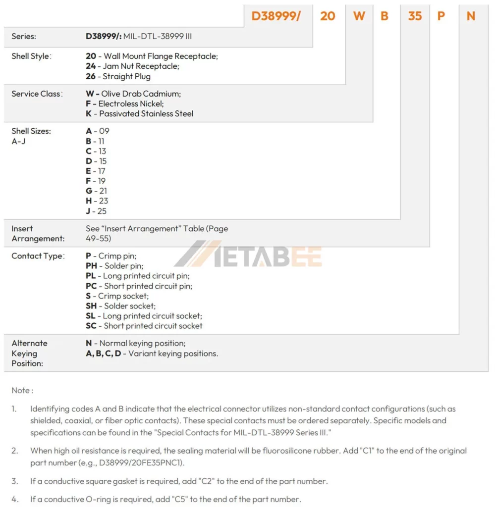 The following information is described using D38999 Series III part numbers. For part numbers corresponding to other series, please consult the METABEE MIL-DTL-38999 Catalog.