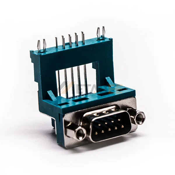 DB9 Male Right Angle Connector for PCB Mount, Through Hole, 2.77mm Pitch, 4-40 UNC Screw Lock, Long Bracket
