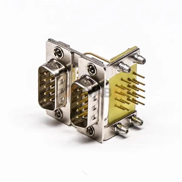 Right Angle D-Sub 9 Pin Male Dual Port Connector for PCB Mount, Through Hole, Machined Contacts