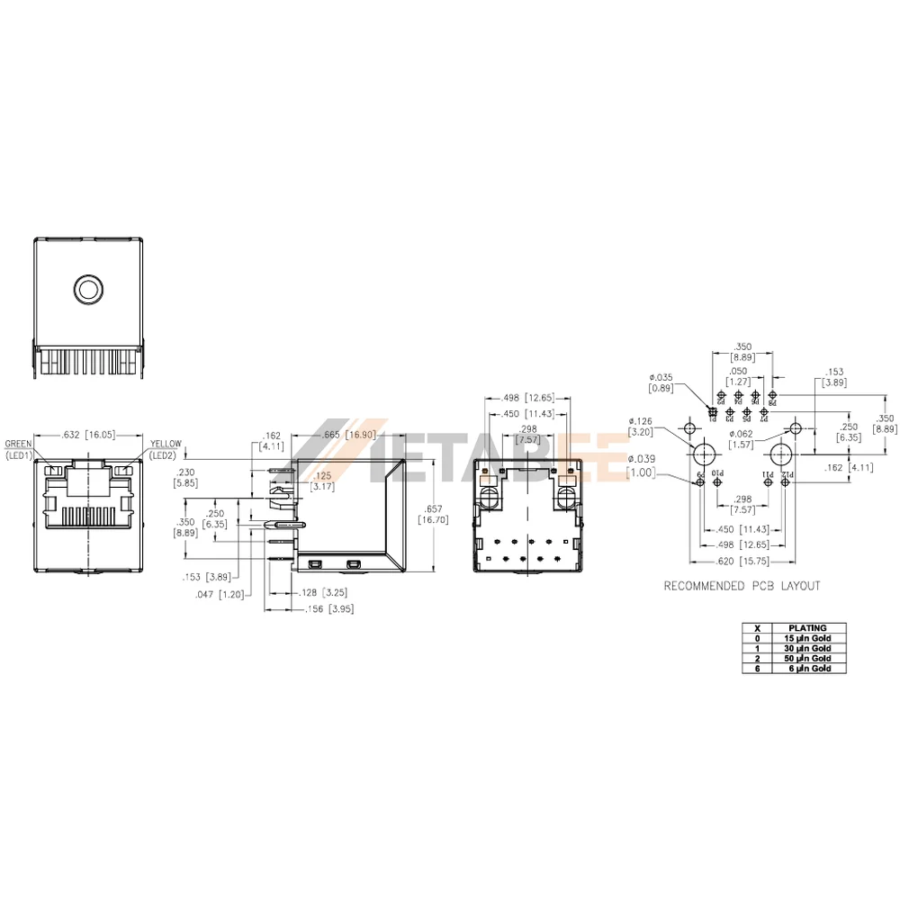 Across various communication platforms, the RJ45 Jack with Magnetics maintains consistent 10/100 Base-T data transmission for high-quality network links. Top-entry vertical orientation allows for high-density board layouts where space is at a premium. Nickel-plated brass shielding provides robust EMI protection to ensure signal integrity across the standard commercial temperature range. Stable mechanical retention on the PCB depends on through-hole termination paired with integrated board locks and solder retention features. Built-in green and yellow LEDs offer immediate visual status feedback within the tab-up profile. Gold-plated copper alloy contacts ultimately guarantee electrical resistance stays below 20mΩ in this RJ45 jack with magnetics.