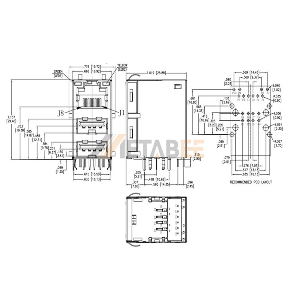 Combined network and peripheral connectivity defines this product, which integrates one RJ45 port and two USB 2.0 ports into a single module. Standard 10/100 Base-T networking speeds are supported reliably for fast Ethernet applications. A robust nickel-plated brass shield encloses the black PBT insulator to reject electromagnetic interference effectively. Industrial environments benefit from the extreme resilience provided by the -40C ~ +85C temperature range. Built-in green and yellow LED indicators provide immediate visual link status updates. Furthermore, gold-plated contacts strictly maintain electrical resistance below 20 miliohms for flawless signal integrity. Typical applications include server motherboards, industrial pc systems, and network routers.
