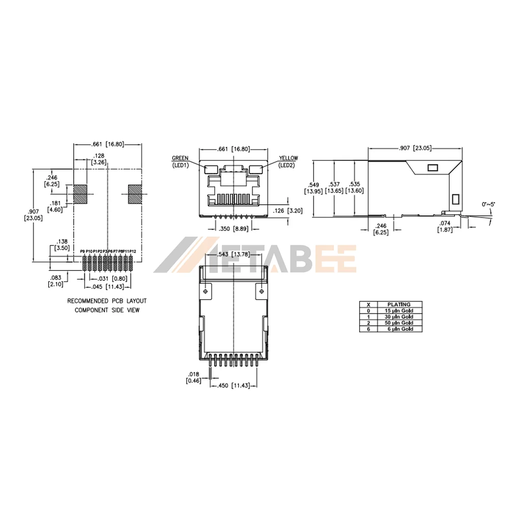 Fast Ethernet connections achieve maximum reliability when utilizing the surface mount magnetic RJ45 jack, specifically developed for standard 100Base-T networks. A robust nickel-plated brass shield entirely encloses the black hi-temp thermoplastic insulator to repel severe electromagnetic interference across 0°C to 70°C commercial temperatures. Precise printed circuit board installation depends on a practical board guide integrated seamlessly into the right-angle, tab-up architecture. Clear visual link monitoring relies on dual green and yellow LEDs positioned flawlessly within the front profile. Furthermore, gold-plated copper alloy contacts strictly maintain electrical resistance below 20mΩ to secure flawless long-term signal clarity without degradation.