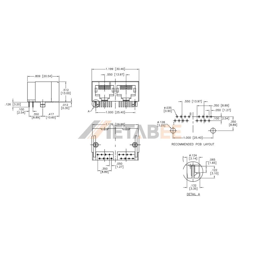 Side-by-side connectivity relies on the ganged RJ45 connector, which integrates two 8P8C ports into a single footprint for high-density board designs. Reliable data transmission across standard Ethernet links is maintained across an extreme industrial temperature range from -40C up to 85C. Robust black PA66 insulation ensures long-term housing integrity during secure through hole board installations. Precise mechanical alignment onto the PCB depends on the right-angle termination profile. High-quality phosphor bronze contacts with gold over nickel plating strictly maintain electrical resistance below 20 miliohms in this ganged RJ45 connector. Every port provides consistent performance without the need for visual LED indicators. Network switches, industrial computers, and automated control systems commonly utilize these durable multi-port sockets.