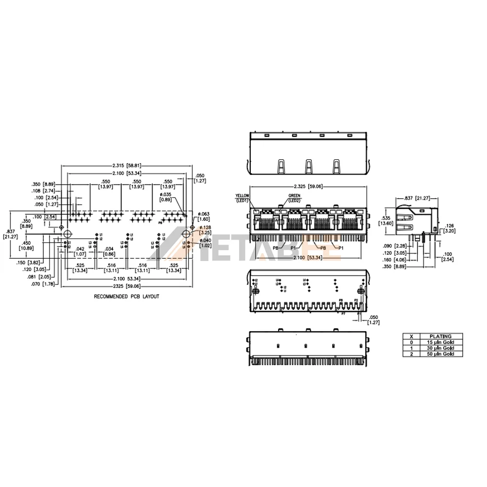 The Magjacks is a shielded 1×4 multi-port network interface designed for industrial Ethernet applications. Reliable 10/100 Base-T data transmission remains consistent across a wide -40°C ~ +85°C temperature range. A robust nickel-plated copper alloy shield encloses the black nylon 46 insulator to block electromagnetic interference effectively. Precise component positioning on the PCB relies on the integrated board guide feature. Visual link status is tracked through built-in yellow and green LED indicators positioned in the tab-up profile. Furthermore, gold-plated phosphor bronze contacts strictly maintain electrical resistance below 30 miliohms in these magjacks. Secure mechanical termination uses a right-angle through hole configuration.
