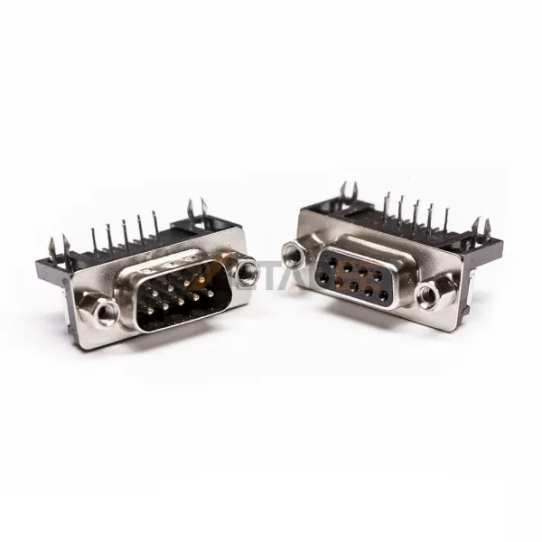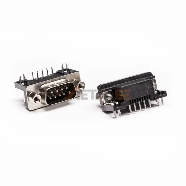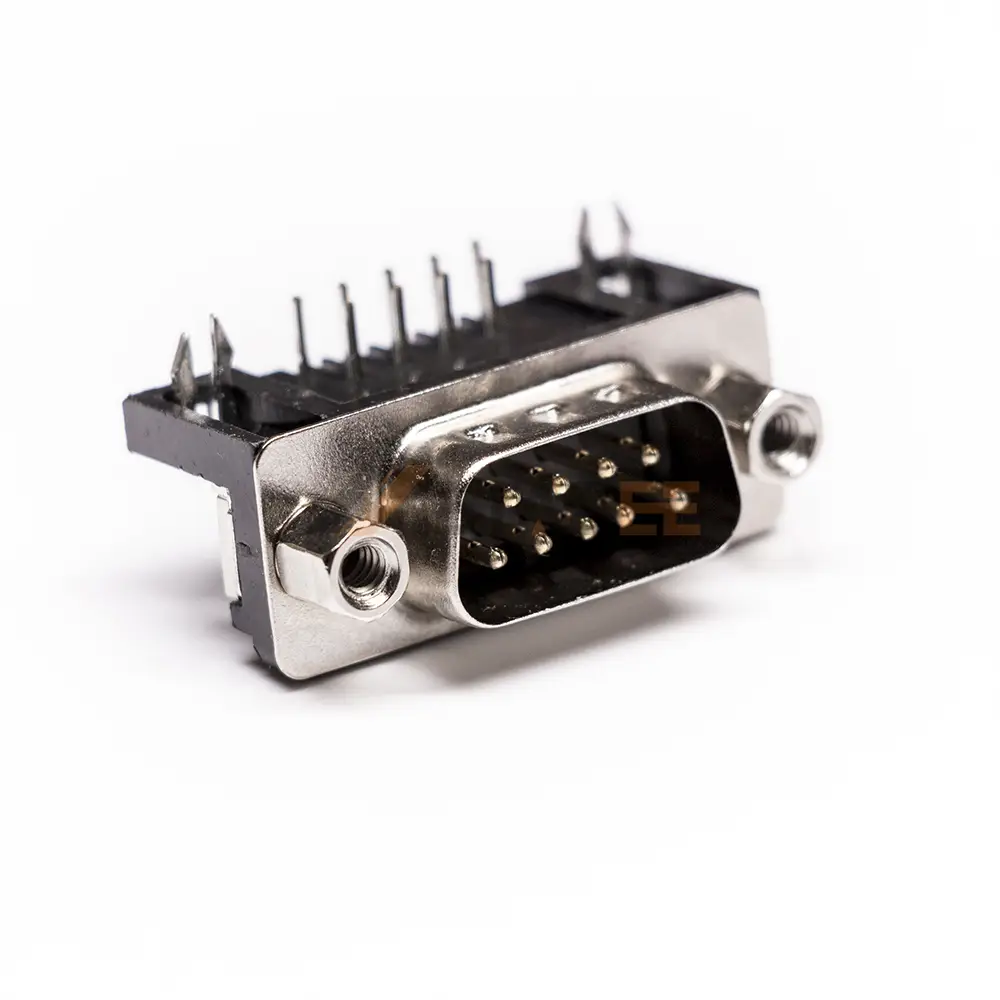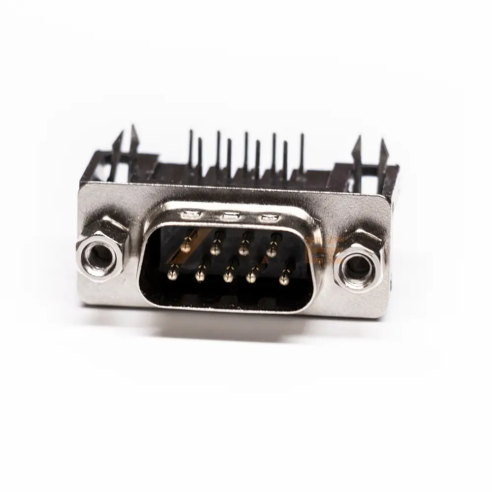 This 90-degree DB9 male connector is engineered for secure PCB mounting. It features integrated 4-40 UNC screw locks, ensuring a vibration-proof mating connection. Its right-angle profile is ideal for space-constrained layouts. The connector mounts using through-hole technology; its solder pins are inserted into the PCB and soldered to form a robust, permanent mechanical and electrical bond. Gold-plated contacts ensure superior signal integrity, making it a high-reliability choice for industrial hardware and embedded systems.