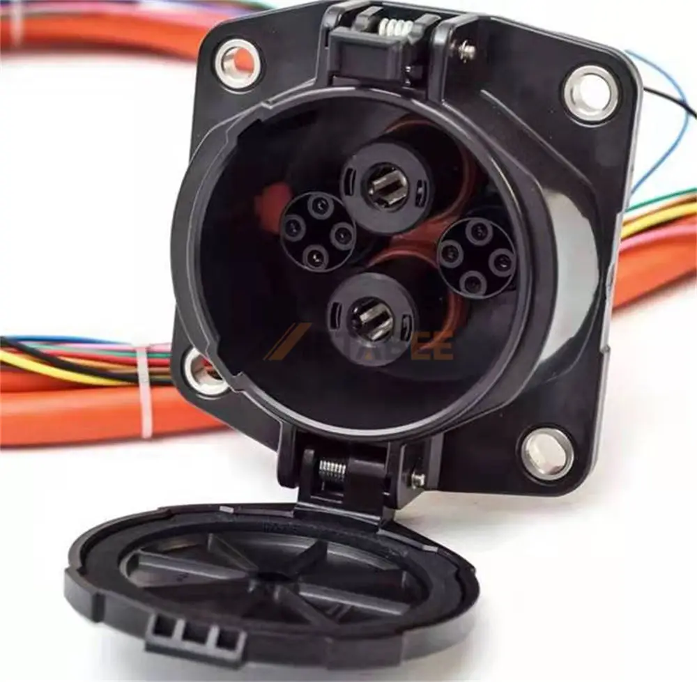 The connector housing is manufactured from high-strength thermoplastic, providing excellent mechanical durability and thermal stability. Copper alloy contacts with silver-plated surfaces reduce contact resistance, enhance conductivity, and ensure long service life under high current loads. With an IP65 protection rating and UL94 V-0 flame retardancy, this connector is suitable for outdoor and commercial EV charging infrastructure.