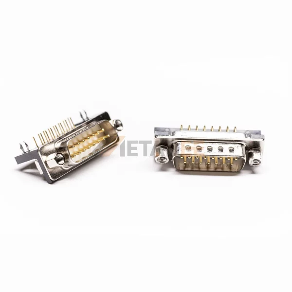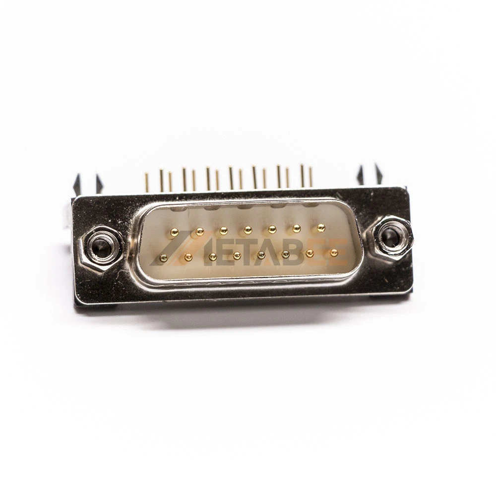 This right-angle DB15 male connector delivers robust signal transmission. Designed for panel-mount PCB integration via through-hole soldering. Features a right-angle orientation for simple integration. Its precision-machined brass contacts ensure superior reliability. Standard 2.77mm pitch guarantees compatibility. Features 15 male signal contacts. Contacts are arranged efficiently in 2 rows. The front screw lock ensures vibration-proof mating security. Contacts feature a nickel underplate and gold plating. Rated for 750V and 5A current capacity. Maximum contact resistance is 10 mΩ. The rugged nickel-plated steel shell provides excellent durability. Contact plating thickness is 3.00 µin. Rated UL94 V-0 for flame safety. Operates reliably from -55°C to +125°C. Ideal for demanding industrial and instrumentation applications requiring high-integrity connections.