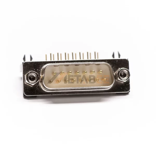 15 Pin D-Sub Right Angle Male Connector for PCB Mount, 2.77mm Pitch, Machined Contacts, Front Screw Lock