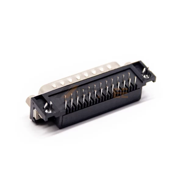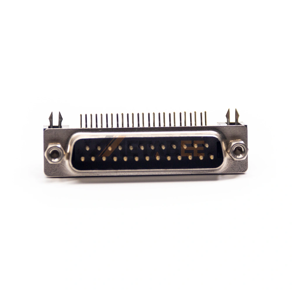 - 25-Pin Right Angle Male Connector: Offers 25 male signal contacts in a space-saving 90-degree PCB mount design.