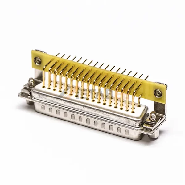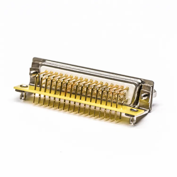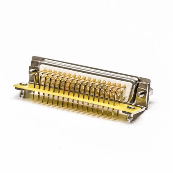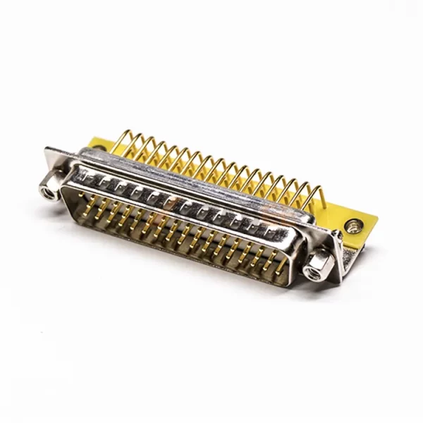 This D-sub 50 pin right angle connector is engineered for secure PCB mounting. It uses the through-hole mounting method, creating a strong and reliable solder joint for excellent mechanical stability. Its right angle profile is ideal for space-constrained layouts. The connector mounts using through-hole technology; its solder pins are inserted into the PCB and soldered to form a robust, permanent mechanical and electrical bond. Gold-plated contacts ensure superior signal integrity, making it a high-reliability choice for industrial hardware and embedded systems.