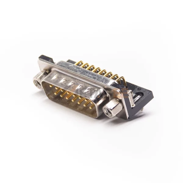 D-Sub DB15 Male Right Angle Connector for PCB Mount, Machined Contacts, 2.77mm Pitch, Front Screw Lock