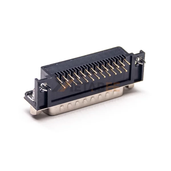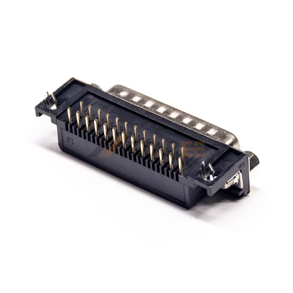 - 25-Pin Right Angle Male Connector: Offers 25 male signal contacts in a space-saving 90-degree PCB mount design.