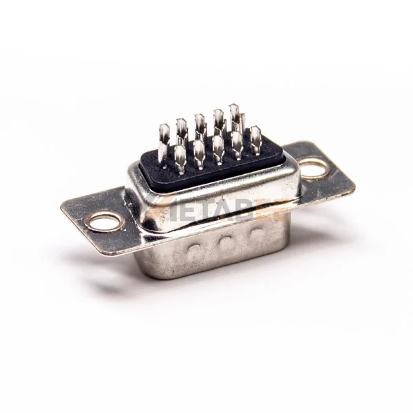 This DB15 high-density male connector delivers maximum connectivity in minimal space. Engineered with a precision 2.29mm pitch. This compact spacing enables high-density signal transmission. Features 15 male signal contacts arranged efficiently in 3 rows. Designed for cable mounting using solder cup termination. Its compact E-size shell defines the high-density standard. Contacts utilize stamped brass construction. Finished with nickel underplate and tin plating. Its nickel-plated steel shell provides rugged corrosion resistance. Operates in temperatures from -25°C to +125°C. Rated for 250V and 5A current capacity. Ideal for space-constrained VGA and industrial applications demanding reliable high-density interconnects.