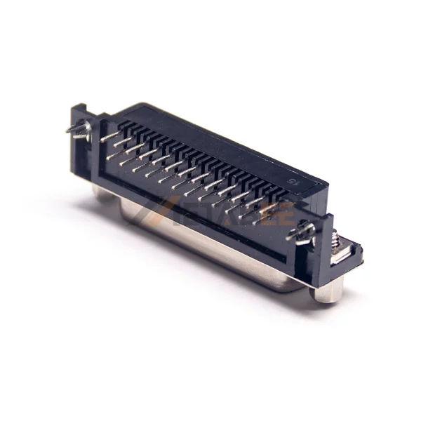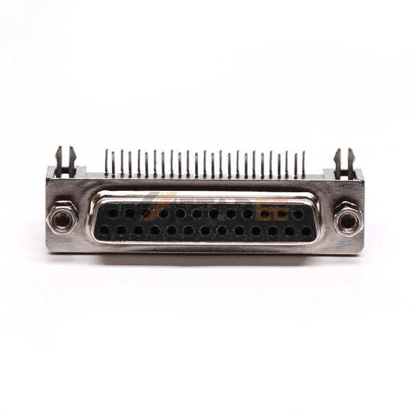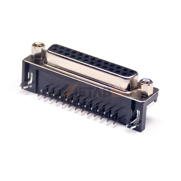 - 25-Pin Right Angle Female Connector: Offers 25 female signal contacts in a space-saving 90-degree PCB mount design.