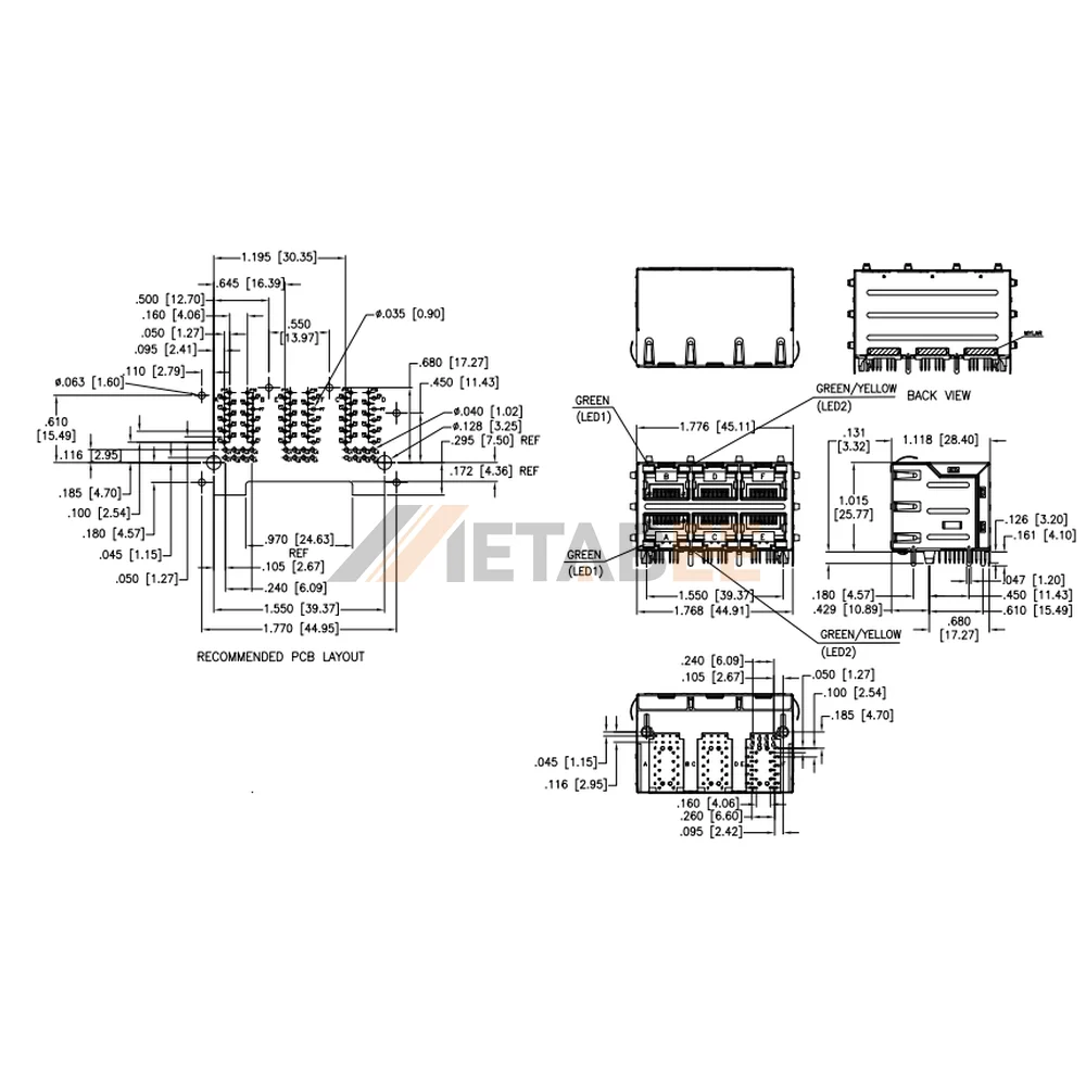 The dual stacked RJ45 is a high-density 2×3 multi-port network interface designed for Gigabit Ethernet applications. Reliable 1000 Base-T data speeds remain consistent throughout the extreme -40 to 85 degrees Celsius industrial temperature range. A robust stainless steel shield encloses the black thermoplastic housing to block electromagnetic interference effectively during high-speed traffic. Visual network link status is monitored through integrated green and green/yellow LED indicators positioned in the stacked profile. Mechanical stability on the PCB depends on right-angle through hole termination paired with board guide and solder retention features. Furthermore, gold-plated phosphor bronze contacts strictly maintain low electrical resistance in this dual-stacked RJ45.