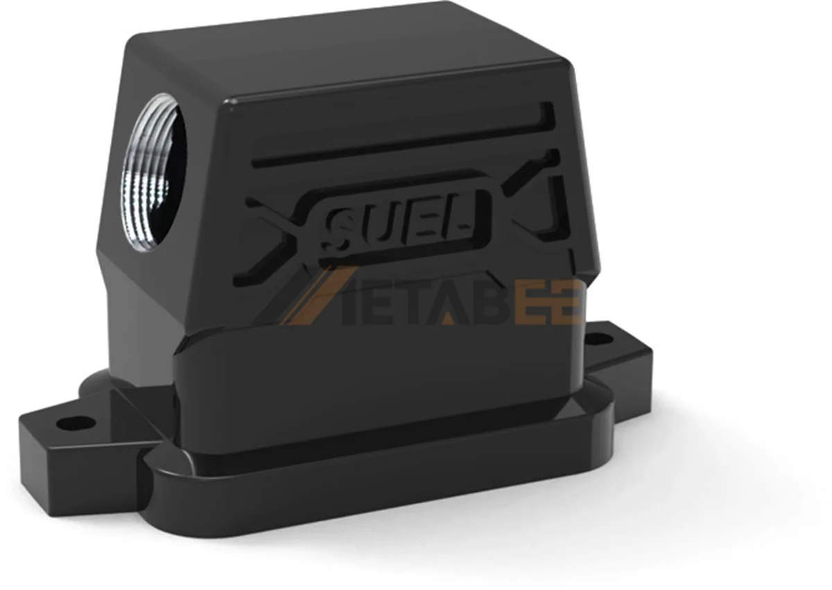 The heavy-duty connector hoods are available in ten standard sizes: 3A, 10A, 16A, 32A, 6B, 10B, 16B, 24B, 32B, and 48B. They are made of aluminum die-cast material and provide reliable IP65 protection. Each hood features a robust locking interface and a built-in sealing gasket to ensure a secure connection with the matching housing. Multiple cable-entry directions and thread sizes are available to support different wiring layouts and installation needs.
