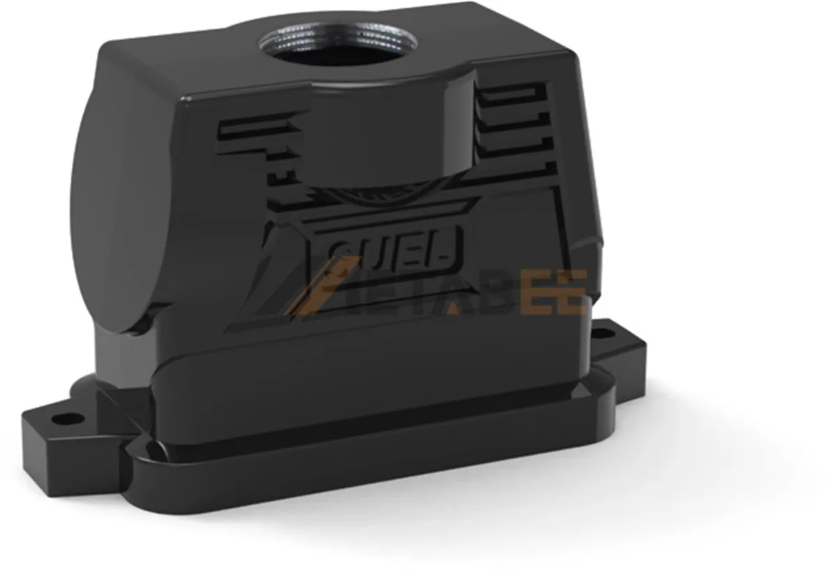 The heavy-duty connector hoods are available in ten standard sizes: 3A, 10A, 16A, 32A, 6B, 10B, 16B, 24B, 32B, and 48B. They are made of aluminum die-cast material and provide reliable IP65 protection. Each hood features a robust locking interface and a built-in sealing gasket to ensure a secure connection with the matching housing. Multiple cable-entry directions and thread sizes are available to support different wiring layouts and installation needs.