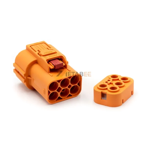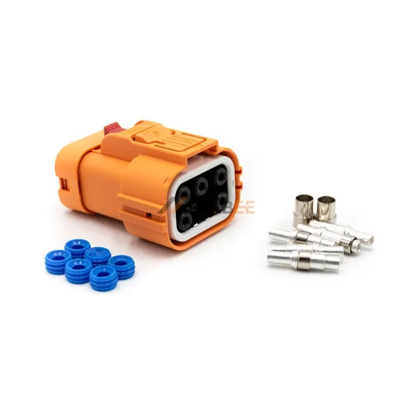 Built to withstand demanding environments, this shielded connector boasts an IP67 rating for complete protection against dust and water immersion. It is rated for 800V DC and 40A, with a wide operating temperature range of -40°C to 125°C. The 6mm² wire gauge is ideal for managing high-current flows, making it a perfect and safe choice for electric vehicle and industrial power systems.