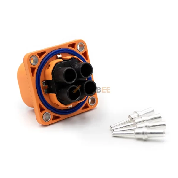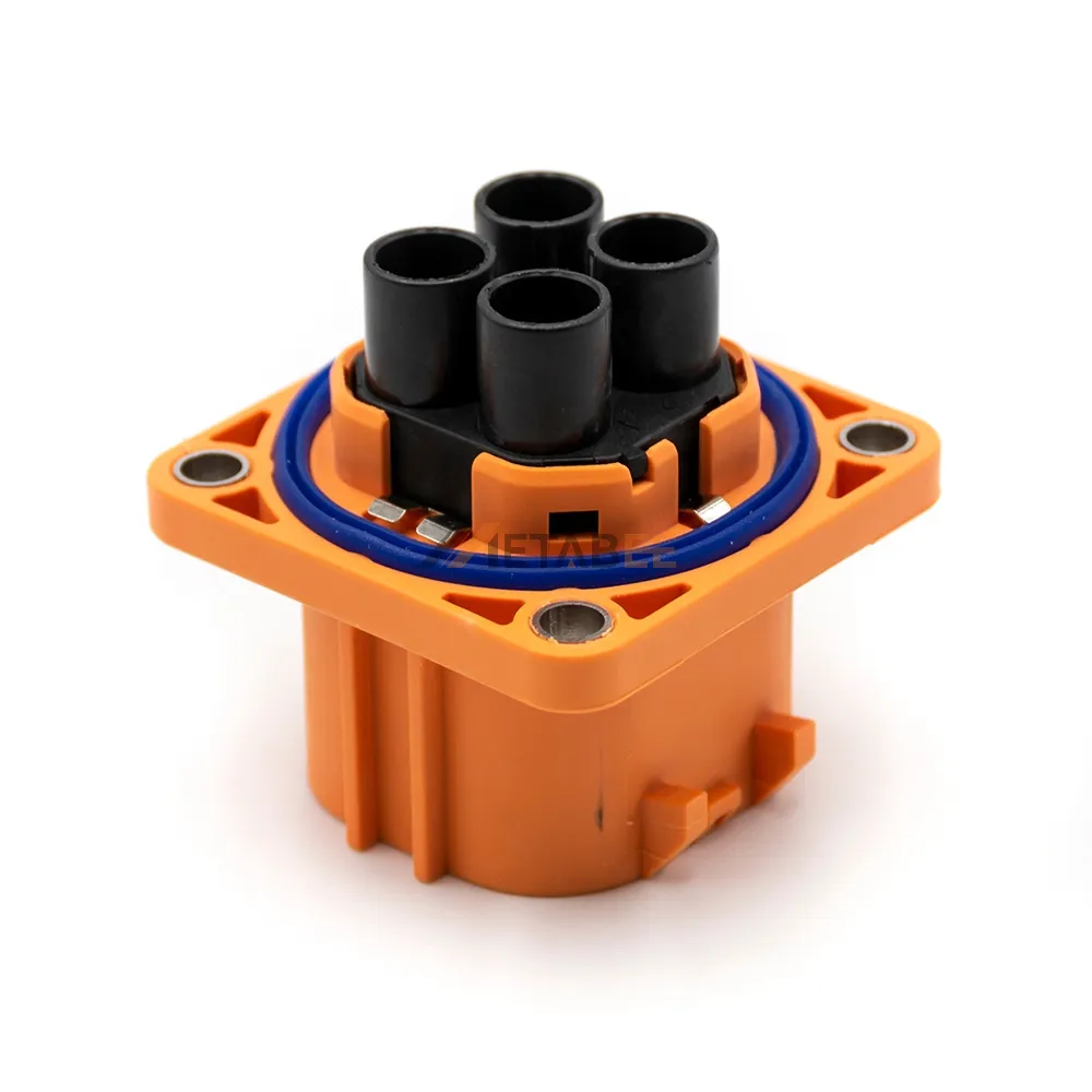 This 4-pin straight socket connector is engineered for robust performance in electric vehicle high-voltage interlock loops (HVIL). Constructed with a PA66-GF material shell offering UL94V-0 flame resistance, it ensures superior protection in demanding environments. The copper alloy contacts, finished with a reliable tin plating, are designed for a 6mm² shielded wire, guaranteeing stable power transmission and signal integrity. Rated for 800V DC and 40A, this connector is built to handle the high-power demands of modern EV systems. Its IP67 rating provides complete protection against dust and temporary immersion, while the operating temperature range of -40°C to +125°C ensures consistent performance in extreme conditions. The integrated A-key polarization prevents mismating, enhancing safety and reliability.