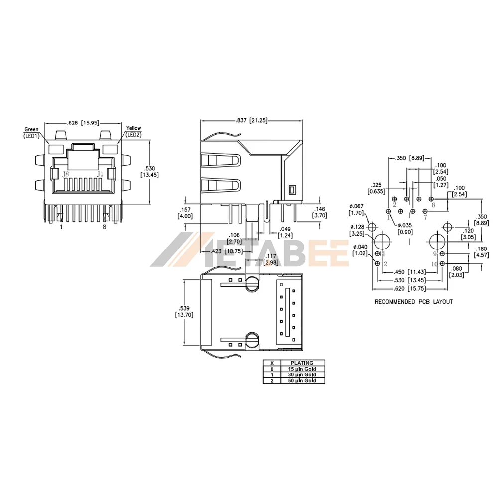 Combining high-performance filtering with a compact physical interface, this integrated 10/100Base T Ethernet LAN RJ45 Jack Connector simplifies your network board design. It handles signal isolation and noise suppression directly inside the shell, protecting your sensitive internal chips from electrical spikes. The stainless steel shell with nickel plating provides a robust shield against electromagnetic interference. Because it operates across an industrial temperature range of -40°C to 85°C, the component is perfect for harsh environments. Designers benefit from the Tab-Up configuration and board lock feature, ensuring a secure mechanical attachment to the PCB. Integrated green and yellow LEDs allow for quick link status diagnostics without requiring extra parts.