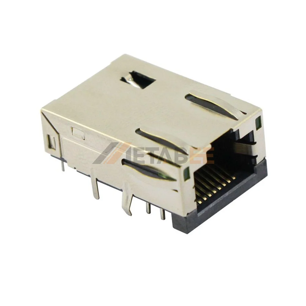 This high-quality RJ45 magjack is a single port female connector designed for reliable PCB mounting. It features a right-angle orientation that simplifies integration into standard networking equipment and space-constrained devices. The 8P8C interface is complemented by integrated yellow and green LEDs to provide immediate visual feedback on link status. With its robust shielded housing, the connector effectively prevents electromagnetic interference to maintain signal integrity. The through-hole design ensures a secure mechanical bond to the board for long-term durability. It is an ideal choice for telecommunication devices and routers requiring a stable modular connection.