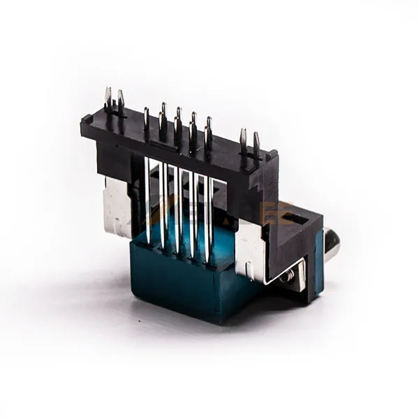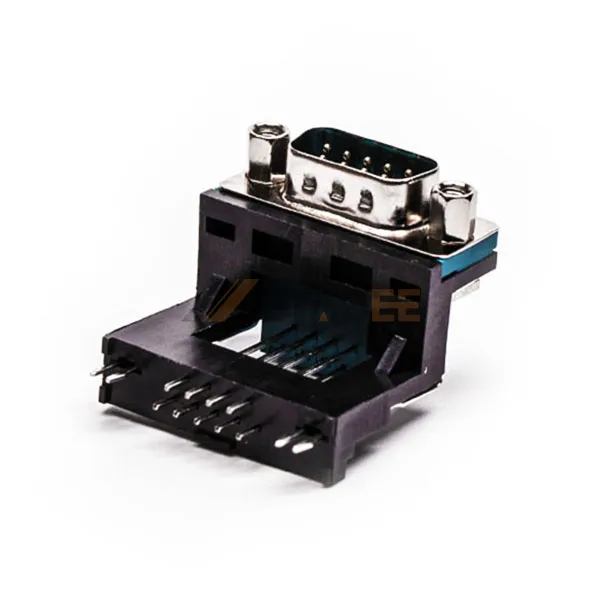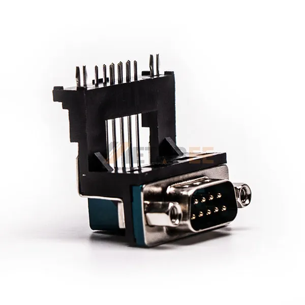 This right angle 9 pin D-sub male connector is engineered for maximum stability. Its right angle profile is ideal for space-constrained layouts. It is designed with a long mounting bracket that provides exceptional mechanical support, reducing stress on the solder joints. The connector uses through-hole technology, and its pins are soldered for a permanent bond. Integrated 4-40 UNC screw locks secure the mating connector, preventing accidental disconnections in high-vibration environments. With gold-plated contacts for superior signal integrity, it’s an excellent choice for robust industrial applications.
