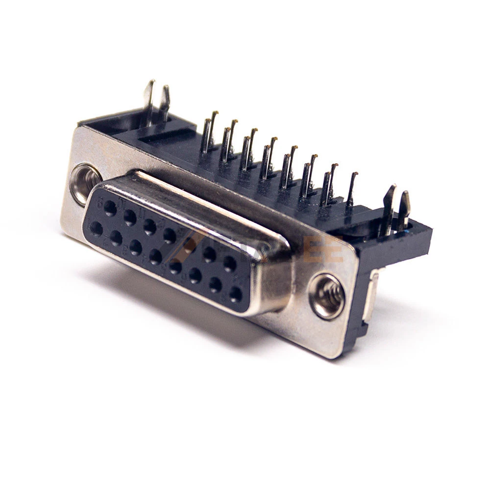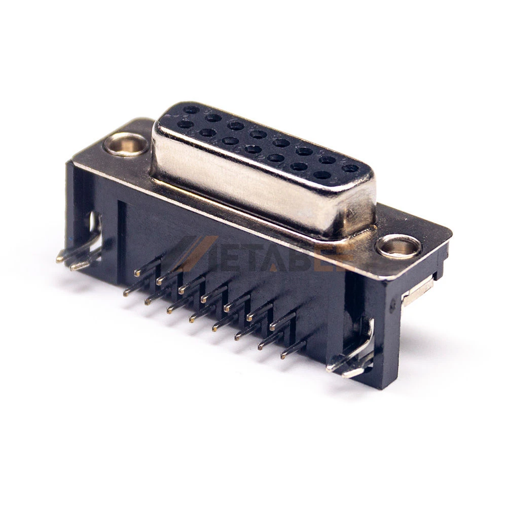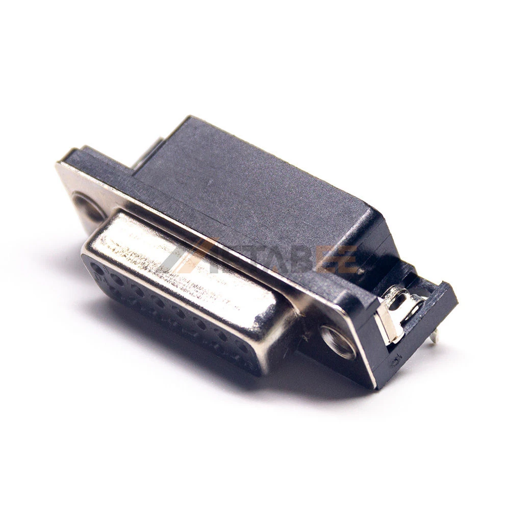 Right Angle D-Sub 15 Pin Female Connector for PCB Mount, Through Hole, 2.77mm Pitch, Rear Rivet Nut
