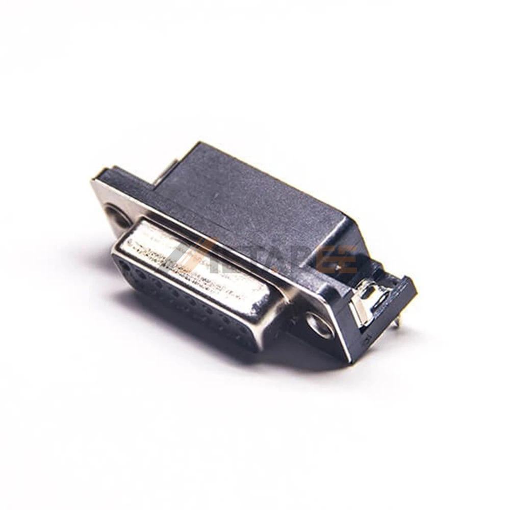 Right Angle D-Sub DB15 Female Connector for PCB Mount, Through Hole, 2.77mm Pitch, Rear Rivet Nut
