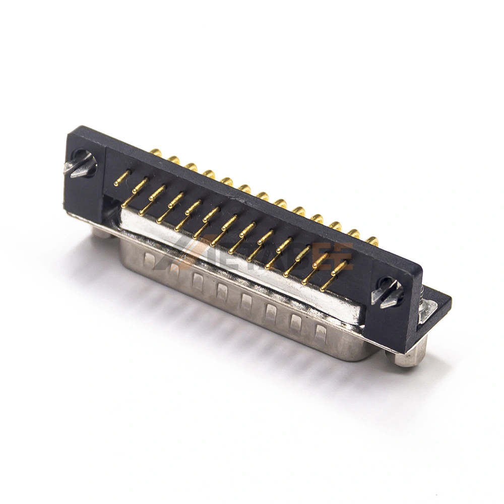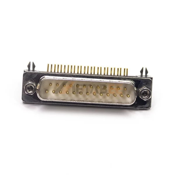 - 25-Pin Right Angle Male Connector: Offers 25 male signal contacts in a space-saving 90-degree PCB mount design.