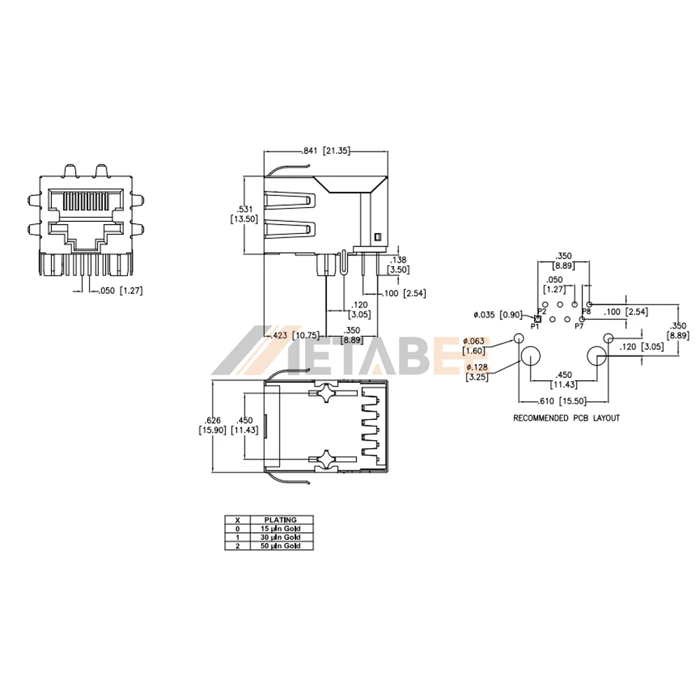 RJ45 Ethernet Jack Connector with Magnetics, 1 Port, 10/100 Base-T, Shielded with EMI, THT, R/A, No LED