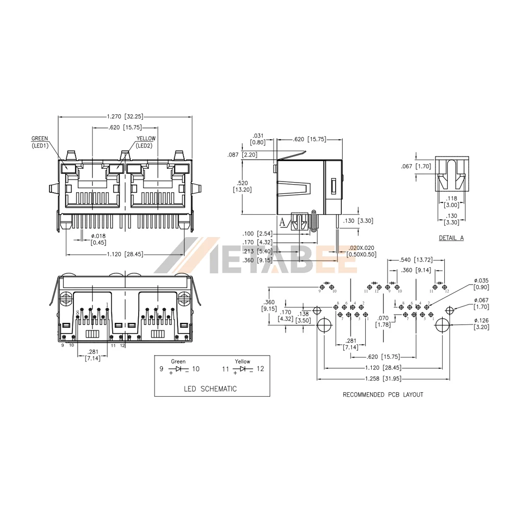 This product is a ganged 1×2 modular interface featuring two side-by-side ports for high-density networking. Operating stability is maintained throughout a wide -40C to +70C temperature range for consistent connectivity. A robust nickel-plated brass shield encloses the yellow hi-temp thermoplastic housing to reject electromagnetic interference effectively. Visual link status relies on integrated green and yellow LED indicators positioned within the tab-up profile. Furthermore, gold-plated phosphor bronze contacts strictly maintain electrical resistance below 30 miliohms in this ganged RJ45 jack. Secure mechanical termination relies on the right-angle through hole configuration for stable board integration. Networking hubs, industrial routers, and server peripherals frequently incorporate this specialized component.