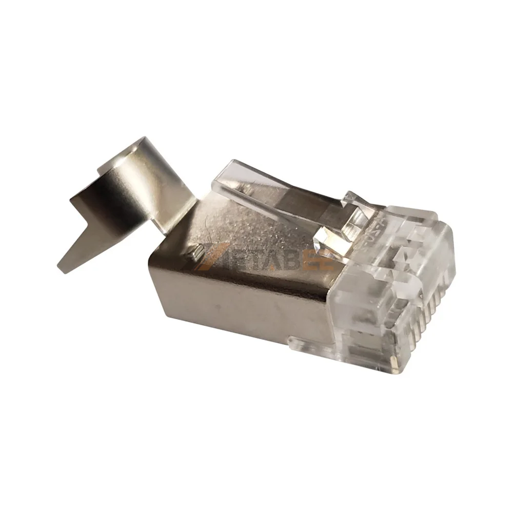 Providing essential protection against electromagnetic interference, this RJ45 Cat6 modular plug features a robust brass shell for signal integrity. It is specifically built to accommodate thick 21-23AWG flat solid cables used in high-bandwidth applications. An integrated external strain relief mechanism enhances mechanical stability by preventing tension on the termination point during use. Because it meets Cat6 standards, this connector supports gigabit ethernet transmission effectively within various networking environments. Technical professionals utilize the 3-prong contacts to pierce solid copper conductors for a lasting electrical bond. The clear PC housing within the metal shell allows for precise wire alignment verification before crimping.