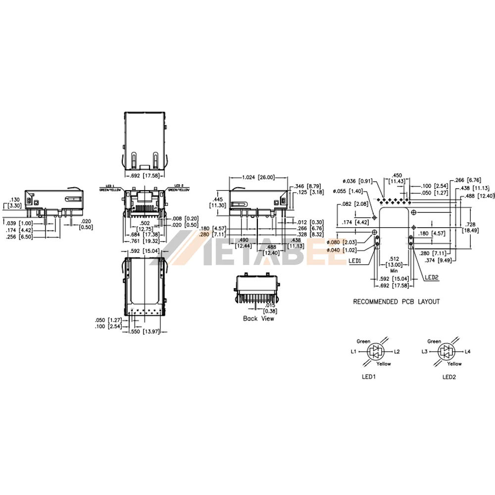 Robust Gigabit network applications rely heavily on premium hardware, and the shielded RJ45 integrated magnetics jack perfectly manages 1G Base-T Ethernet traffic. A durable nickel-plated brass shield completely wraps the black hi-temp thermoplastic insulator to reject electromagnetic interference effectively from 0°C up to an extended 85°C operating temperature. Precise printed circuit board alignment depends on a practical board guide seamlessly integrated into the right-angle, through-hole architecture. Clear visual link tracking utilizes dual green/yellow LEDs positioned flawlessly within the tab-up profile. Furthermore, gold-plated phosphor bronze contacts strictly maintain electrical resistance below 20mΩ to secure long-term signal clarity without degradation.