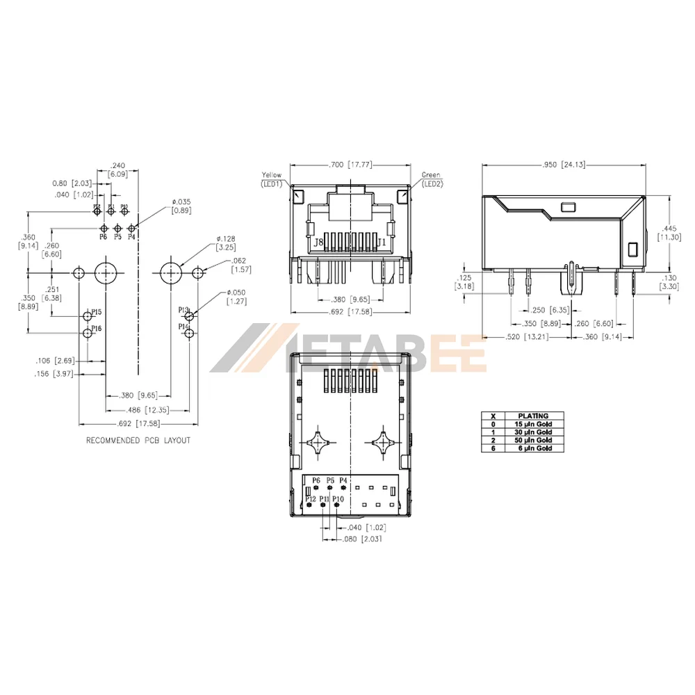 Power over Ethernet capabilities allow the single port RJ45 PoE magjack to handle both data and power efficiently across 10/100Base-T networks. A full nickel-plated brass shield surrounds the connector to block electromagnetic interference effectively. The main housing utilizes durable PA66 insulation, featuring a built-in board lock that guarantees secure right-angle mounting onto the PCB. Yellow and green LEDs are integrated directly into the tab-up profile to supply immediate visual network status. Gold-plated phosphor bronze contacts maintain contact resistance strictly below 20mΩ, establishing a highly reliable connection within a standard commercial temperature range.