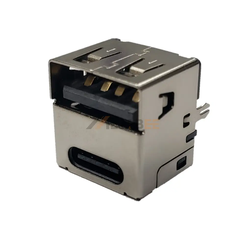The stacked USB 3.0 Type-A over USB 2.0 Type-C connector offers a space-saving dual-port solution for high-density PCB applications. This innovative stacked configuration combines a high-speed USB 3.0 Type-A port with a versatile USB 2.0 Type-C port in a single vertical orientation, streamlining board layout while maximizing functionality. Engineered for through-hole mounting (THM), it ensures robust mechanical retention and reliable solder joint performance. The connector features a copper alloy shell with a nickel-plated finish for superior durability and corrosion resistance, while the contacts are crafted from copper alloy with gold plating to guarantee excellent conductivity and long-term signal integrity. With a wide operating temperature range of -40°C to +85°C and a UL94V-0 flammability rating, this component is built to perform reliably in demanding environments.