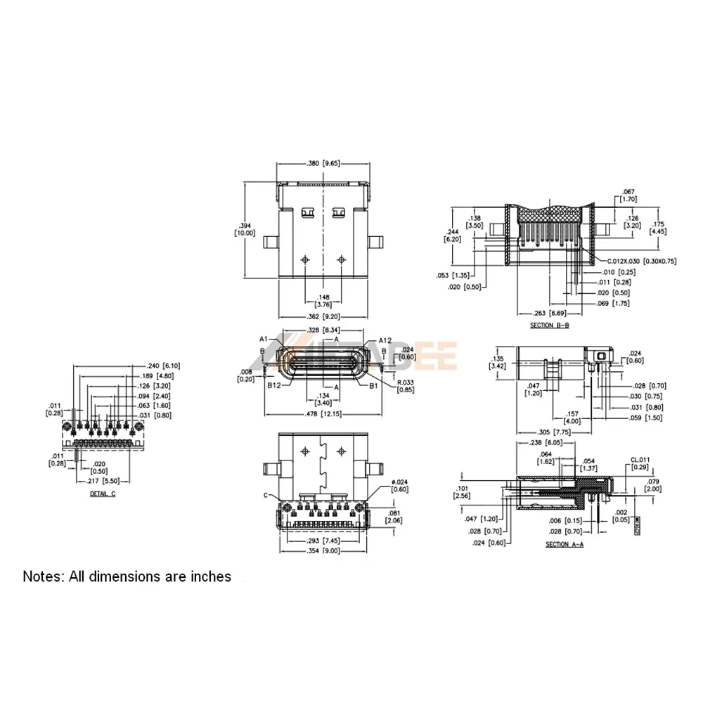Built with longevity and electrical reliability in mind, this Type-C socket utilizes premium materials. The outer shell is constructed from stainless steel with a nickel plating, offering robust structural support and resistance to wear and corrosion. The contacts are made from high-grade copper alloy with a gold-plated finish, ensuring stable signal integrity and minimal insertion loss. With a versatile current rating supporting both 1.25A and 3A at 20V, it is capable of handling both standard signaling and enhanced power requirements. Furthermore, it is UL94V-0 certified for flame retardancy and operates reliably in temperatures ranging from -40°C to 85°C, making it suitable for a wide array of commercial and industrial applications.