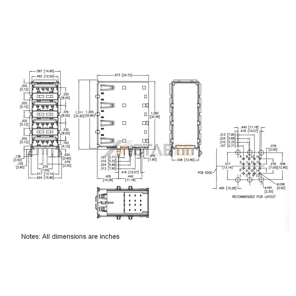 USB-A 2.0 Female Connector, 16 Pin, Quad Port, PCB Thru-Hole, R/A