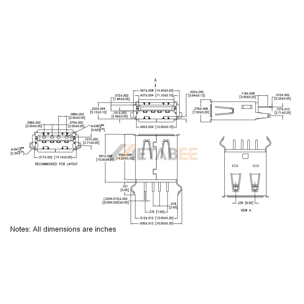 Vertical USB 2.0 Type A Female Connector, 4 Pin, PCB Thru-Hole