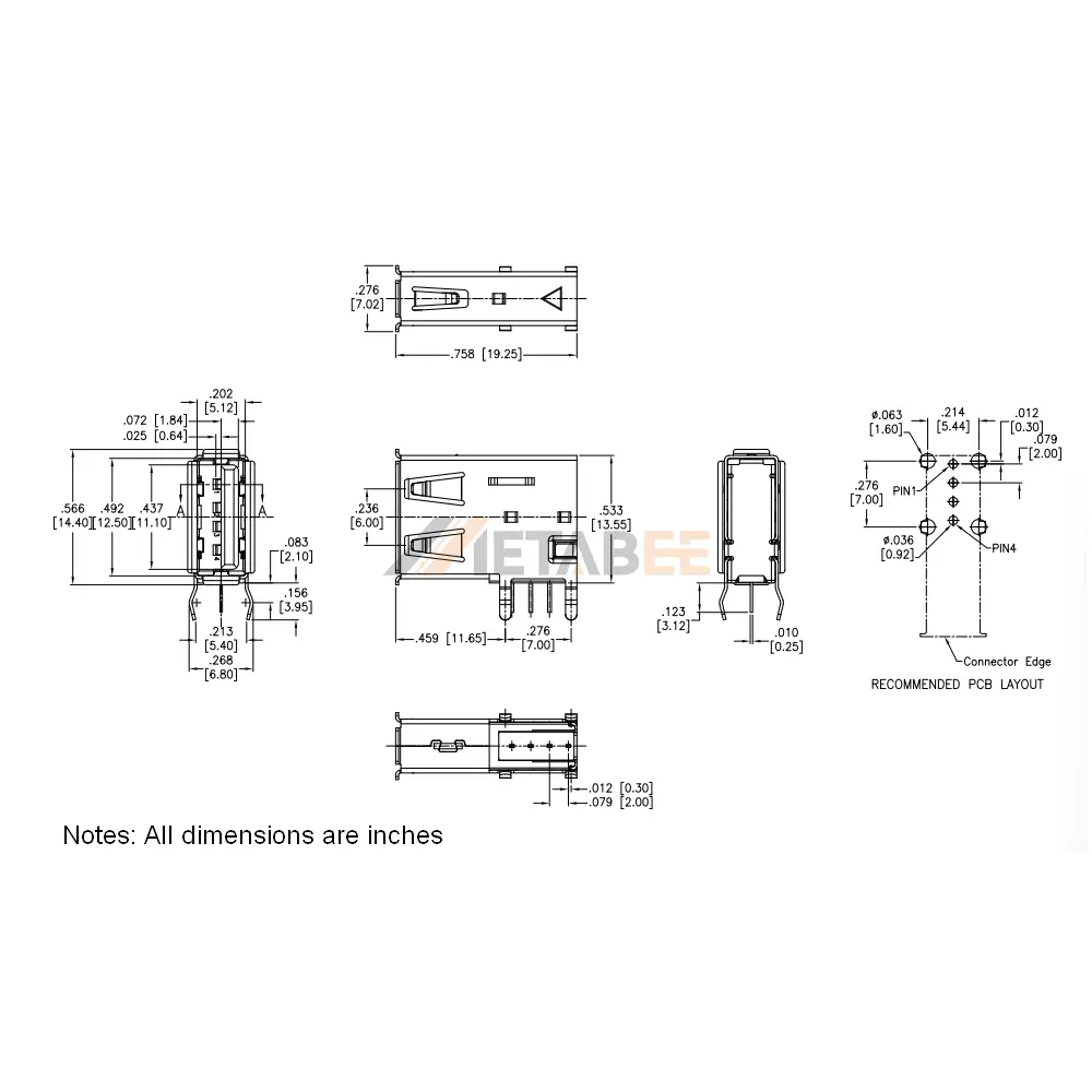 - USB 2.0 Type-A Female Receptacle, 4-pin single-port design