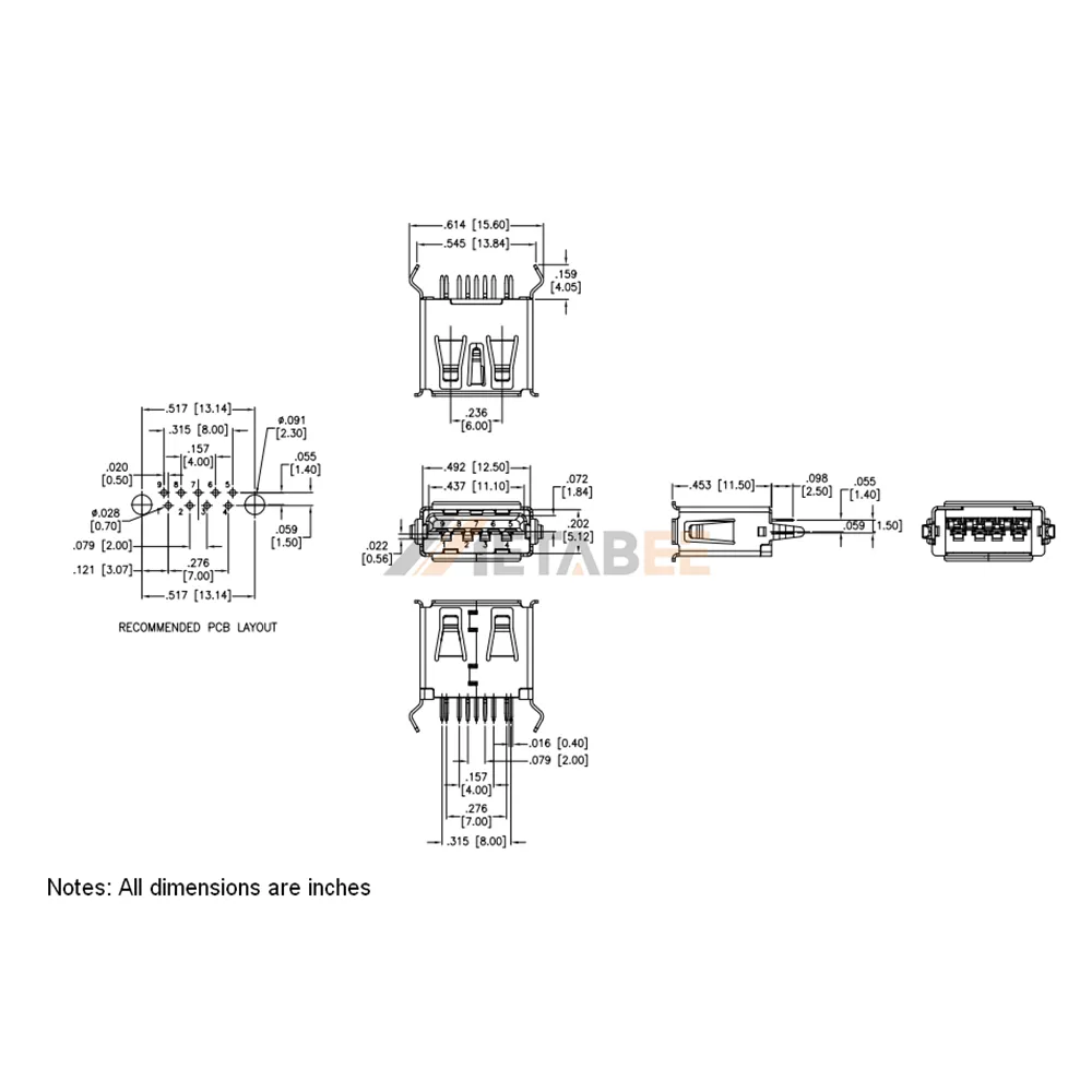Vertical USB 3.0 Female Connector, Type A, 9 Pin, PCB Thru-Hole