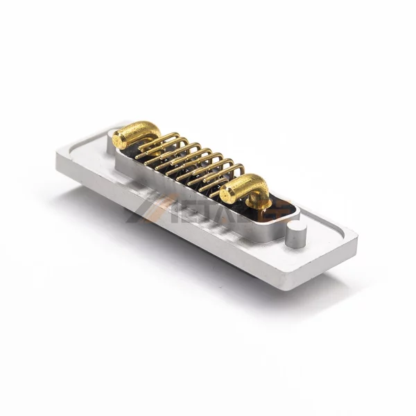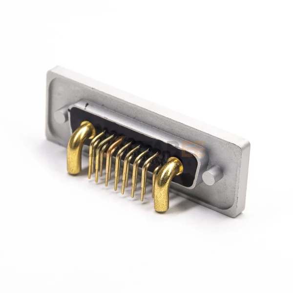 This is a 17W2 hybrid D-Sub connector with a B-size shell. The Combo D-Sub combines both signal contacts and power contacts in a single connector. 17W2 has two power contacts and 15 standard signal contacts. Achieves IP67 waterproof rating. Protects against dust and water immersion. Ensures reliability in harsh conditions. Features a right-angle orientation for space-saving PCB mounting. Solder termination creates a permanent PCB bond. The connector utilizes precision-machined contacts to guarantee high power transmission. Gold-plated brass contacts ensure superior conductivity. Operates reliably from -55°C to 125°C. Handles up to 40A current and 500V. Built for industrial power needs.