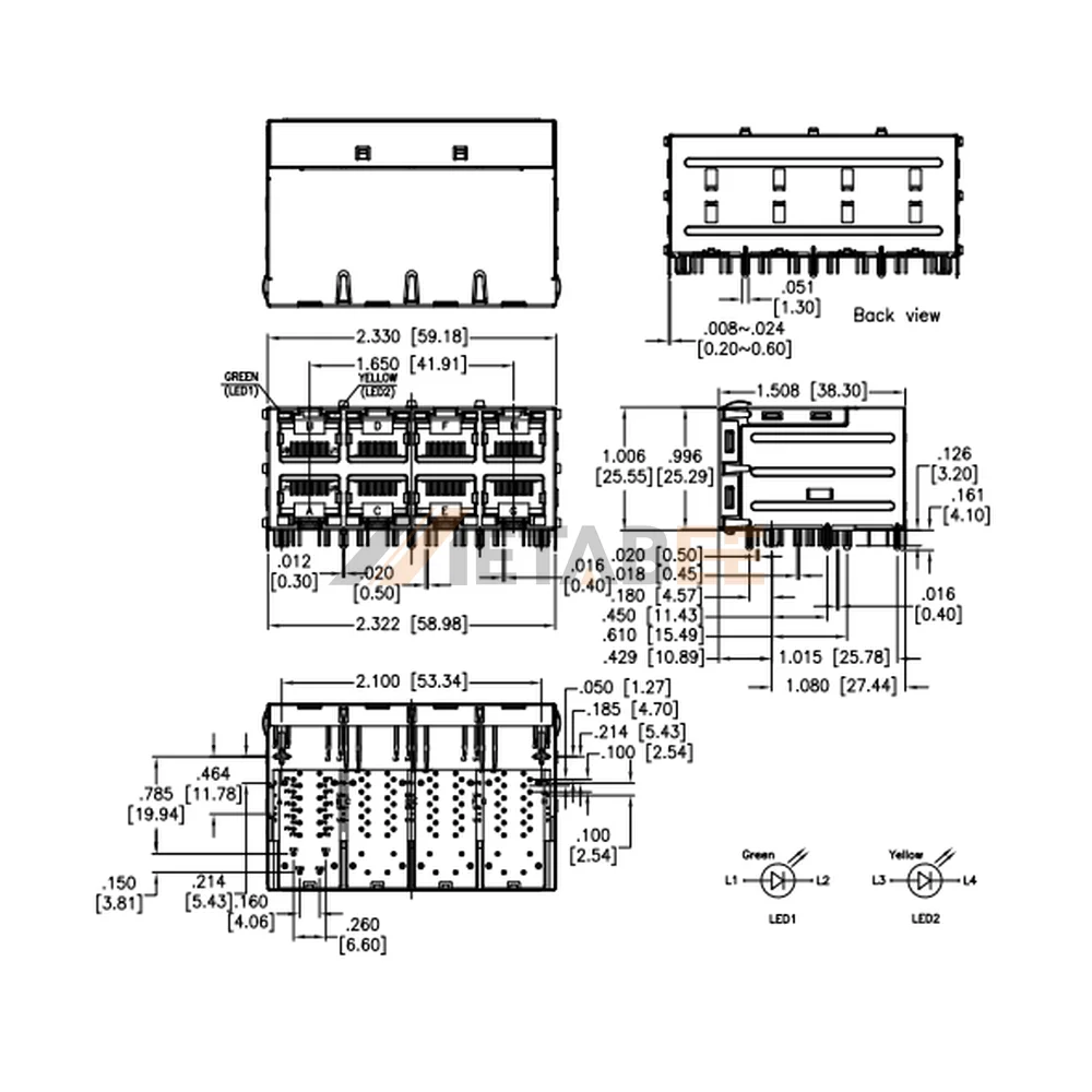 The Stacked RJ45 PoE+ MagJack Connector is a high-density 2×4 multi-port network interface designed for Gigabit Ethernet and power delivery. Reliable 1000 Base-T data speeds remain consistent across an extreme industrial temperature range from -40 to +85 degrees Celsius. A robust nickel-plated stainless steel shield encloses the black hi-temp thermoplastic housing to block electromagnetic interference effectively. Precise component positioning on the PCB depends on the integrated board guide and solder retention features. Visual status updates rely on built-in green and yellow LED indicators positioned within the stacked profile. Furthermore, gold-plated phosphor bronze contacts strictly maintain low electrical resistance in this stacked RJ45 PoE+ MagJack connector. Secure mechanical termination uses a right-angle through-hole configuration.