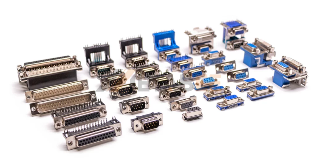 - VGA/HD15 (E-Size): The VGA connector (HD15) uses a smaller E-size shell. The “high-density” pin layout (2.29mm pitch) allowed engineers to fit 15 pins into this more compact E-size shell.