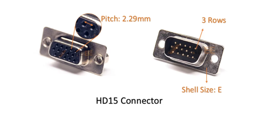 The term “VGA connector” is commonly used to refer to the HD15 connectors, a kind of high-density D-Sub connectors. IBM introduced it in 1987 with its Video Graphics Array (VGA) display standard. While everyone calls it “VGA,” its technical name is actually DE15. The “E” denotes a smaller E-size shell, and it has 15 pins. It’s also widely known as an HD15 (High-Density) connector.