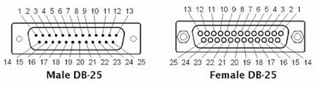 - The pin positions on male and female DB25 connectors are mirror images.