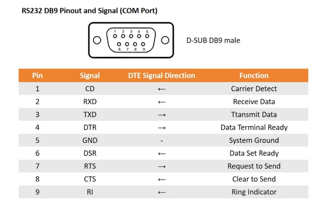 A computer’s COM port (DTE) is typically male, while any peripheral device connected to it typically has a female connector (DCE). Because the RS232 protocol defines signal names from the perspective of the DTE, the following description focuses on the pinout of PC serial ports. The column marked “Direction” shows the signal direction with respect to the DTE.