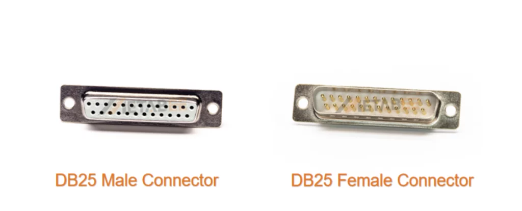 - Male (Plug): A DB25 male connector is characterized by a set of solid, protruding pins. It is typically found on the end of a cable and is designed to be inserted into a female receptacle.
