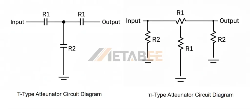 - π-type Attenuator: Features two shunt resistors and one series resistor arranged in a “π” configuration. It provides low insertion loss.