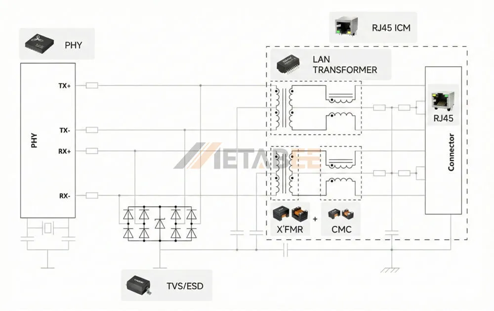 - Isolation Transformers: These provide galvanic isolation (typically 1500V or 2250V) between the cable side (Line side) and the chip side (PHY side). They allow the data signal to pass through via magnetic induction while blocking DC voltage and protecting the sensitive PHY chip from dangerous spikes.