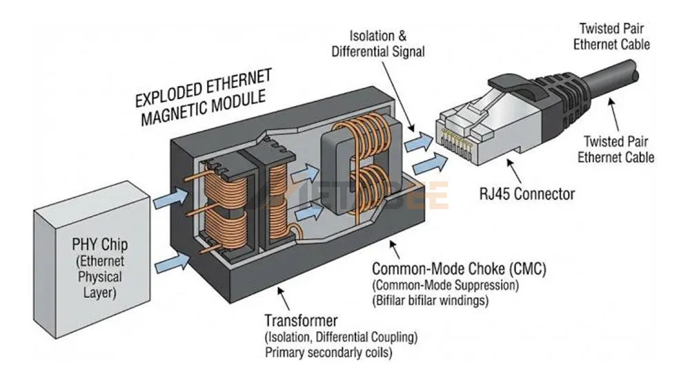 - PoE / PoE+ / PoE++: The magnetics are built with thicker wire gauges and special core materials to handle DC current without saturating (which would block the data signal).